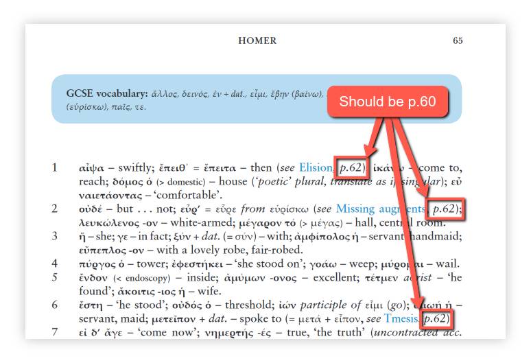 In early print runs of the book, throughout the notes on the extracts from the Iliad (pages 64 to 79), some of the references back to the introductory section are out by two pages. Please see the screenshot below for an example. We apologise for the inconvenience.