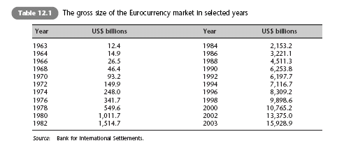 Since the 1960s there has been an astonishing rate of growth of the Eurocurrency market (see Table 12.1). In 1963 the gross total value of Eurobank assets (a similar figure applies to deposit liabilities) was approximately $12.4 billion, but by the end of 2003 the Eurodollar market stood at $15,929 billion, works out at an average growth rate of 19.6% per annum over the 40 years! Measuring the actual size of the Eurocurrency market presents some difficulty because a distinction needs to be made between the gross and net size of the Eurocurrency market. The gross measure includes both non-Eurobank and interbank deposits, while the net measure excludes interbank deposits. The gross measure gives an idea about the overall activity in the Euromarkets while the net measure gives a better indication concerning the ability of the Eurobanking system to create credit.